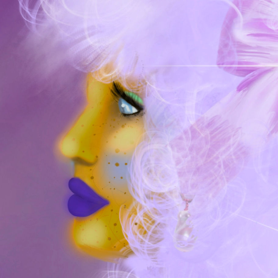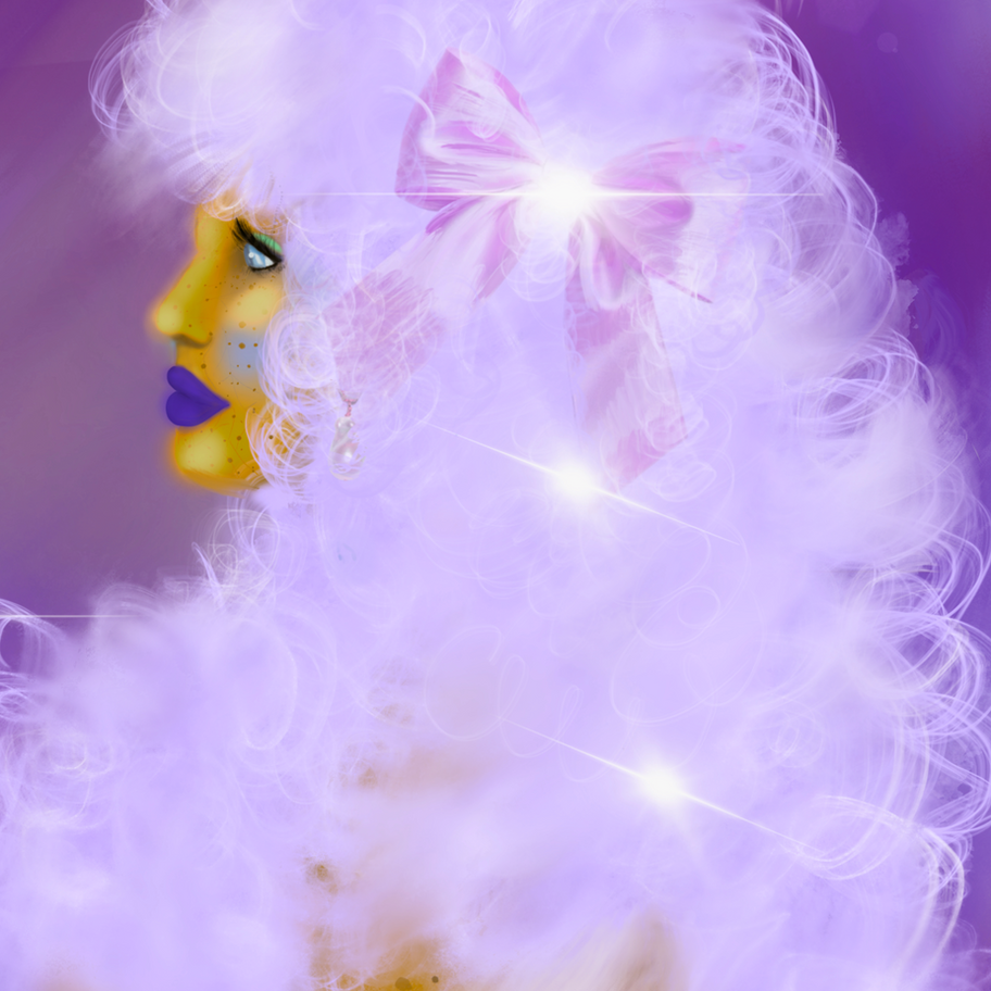 This magic spell captures Fridi in soft wavy hair with a giant bow, rendered in vibrant bright purple, radiating feminine, mystical, and magical energy. Her side profile exudes elegance, playfulness, and a sense of sacred insight, inviting you to connect with your inner guidance.